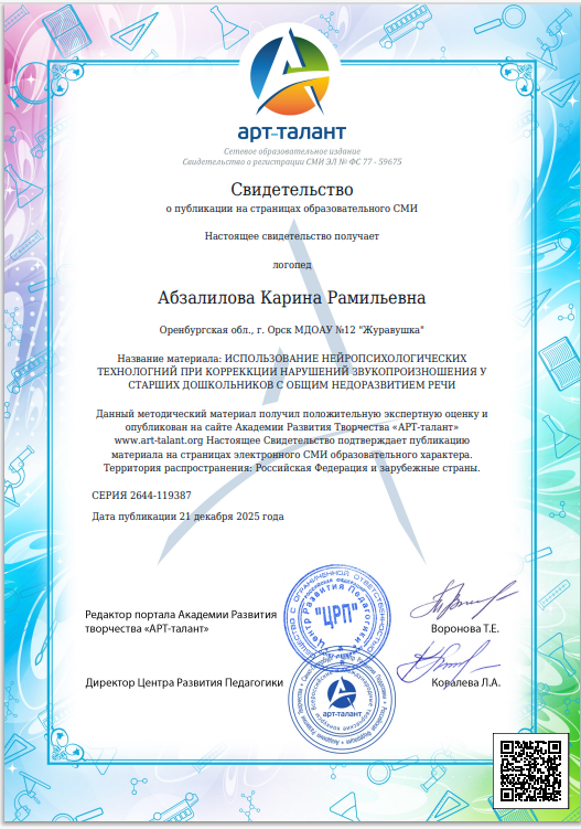 Электронное портфолио учителя-логопеда МДОАУ "Детский сад №12 "Журавушка" комбинированного вида г. Орска"